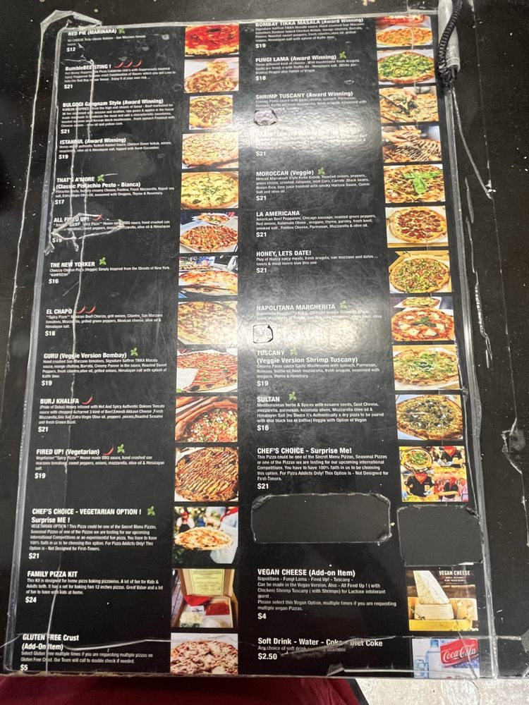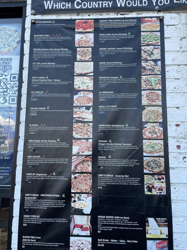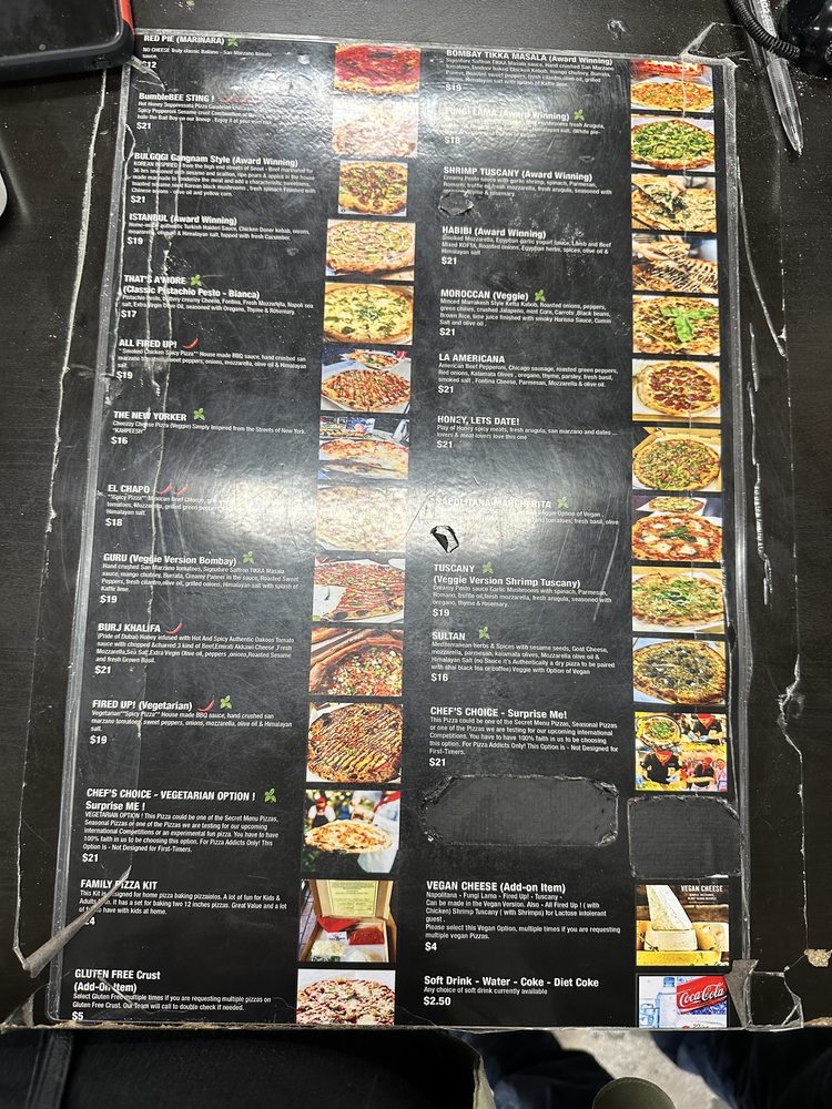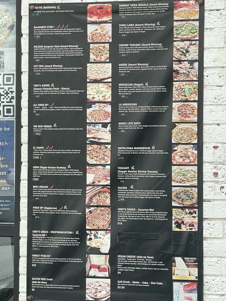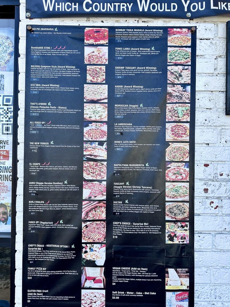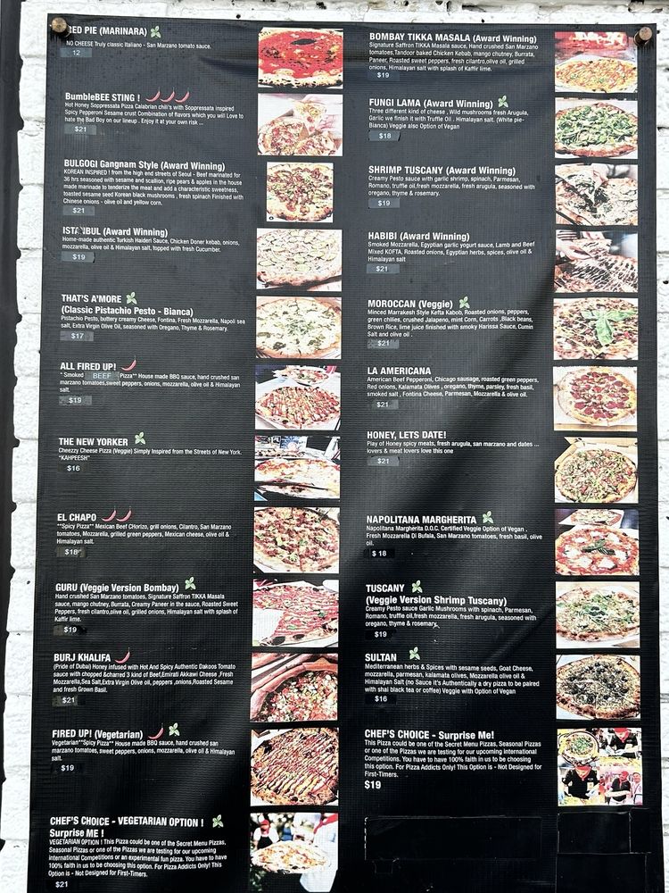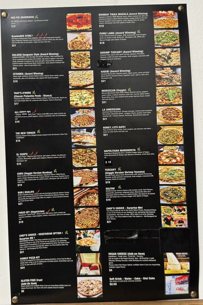 (Award winning) also option of veggie (guru) hand crushed san marzano tomatoes, signature saffron tikka masala sauce. Tandoor baked chicken kebab, mango chutney, burrata, paneer, roasted sweet peppers fresh cilantro, olive oil, grilled onions, himalayan salt with splash of kaffir lime.